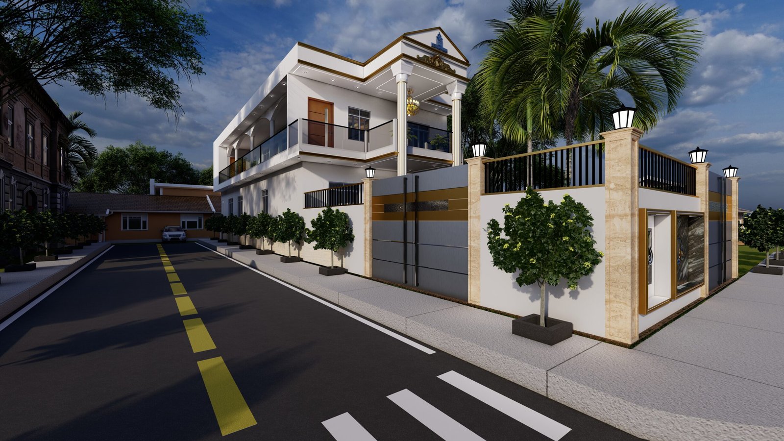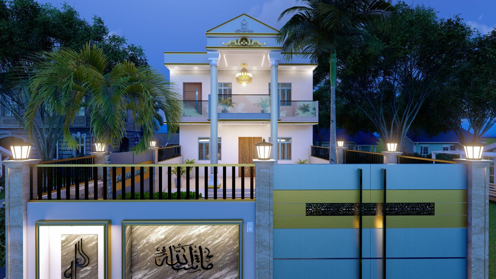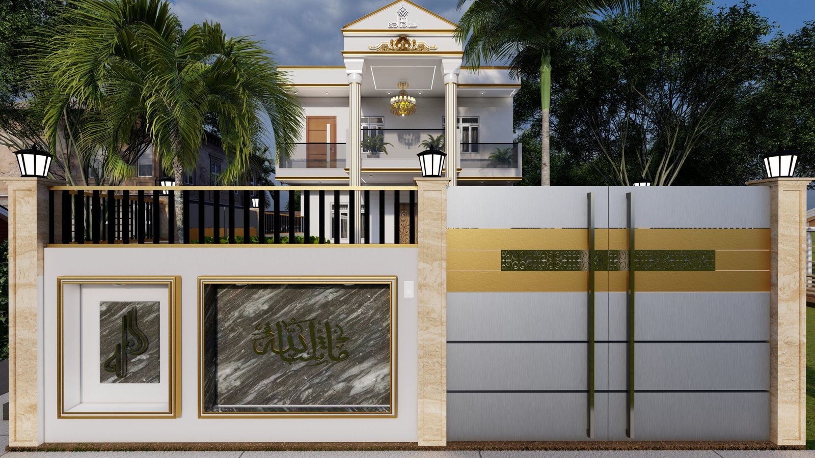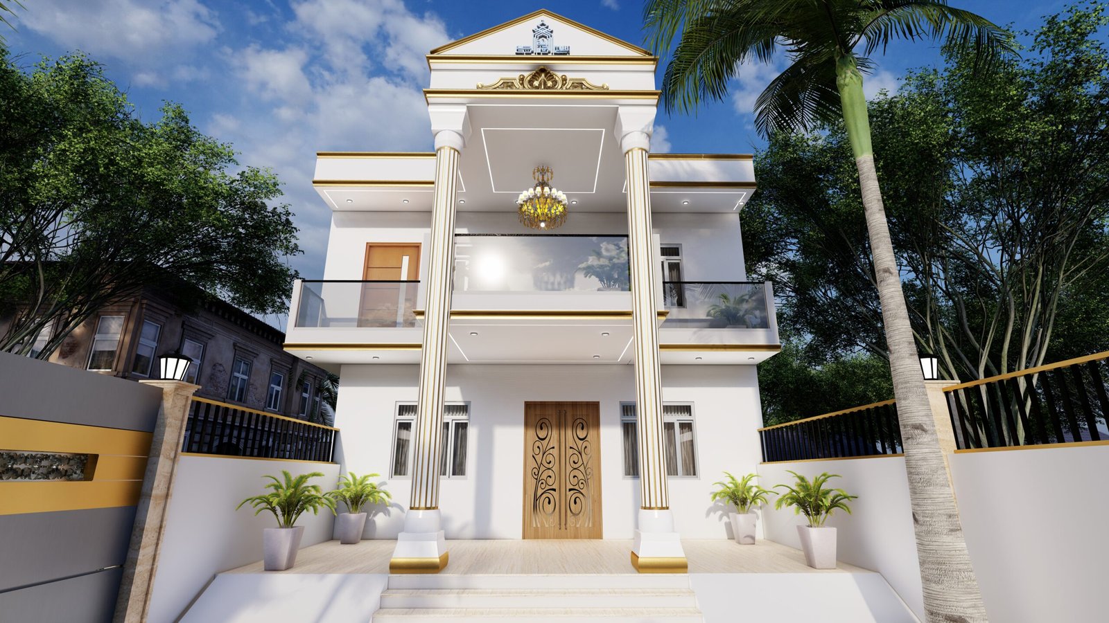 This design features a clean classical-modern look with tall gold-detailed pillars, a wide balcony with glass railings, an elegant double-door entrance, and a white and gold color palette. The chandelier, decorative pediment, and surrounding greenery add a premium and luxurious feel to the elevation.